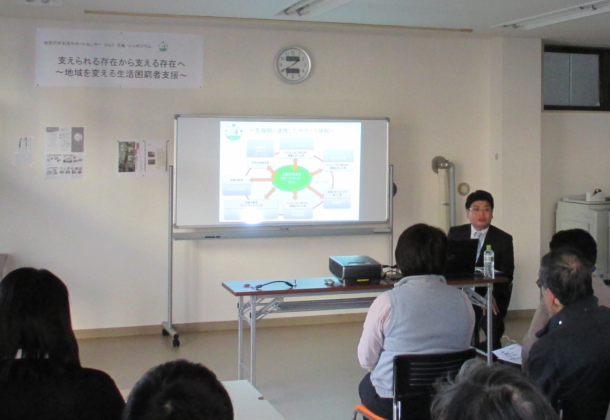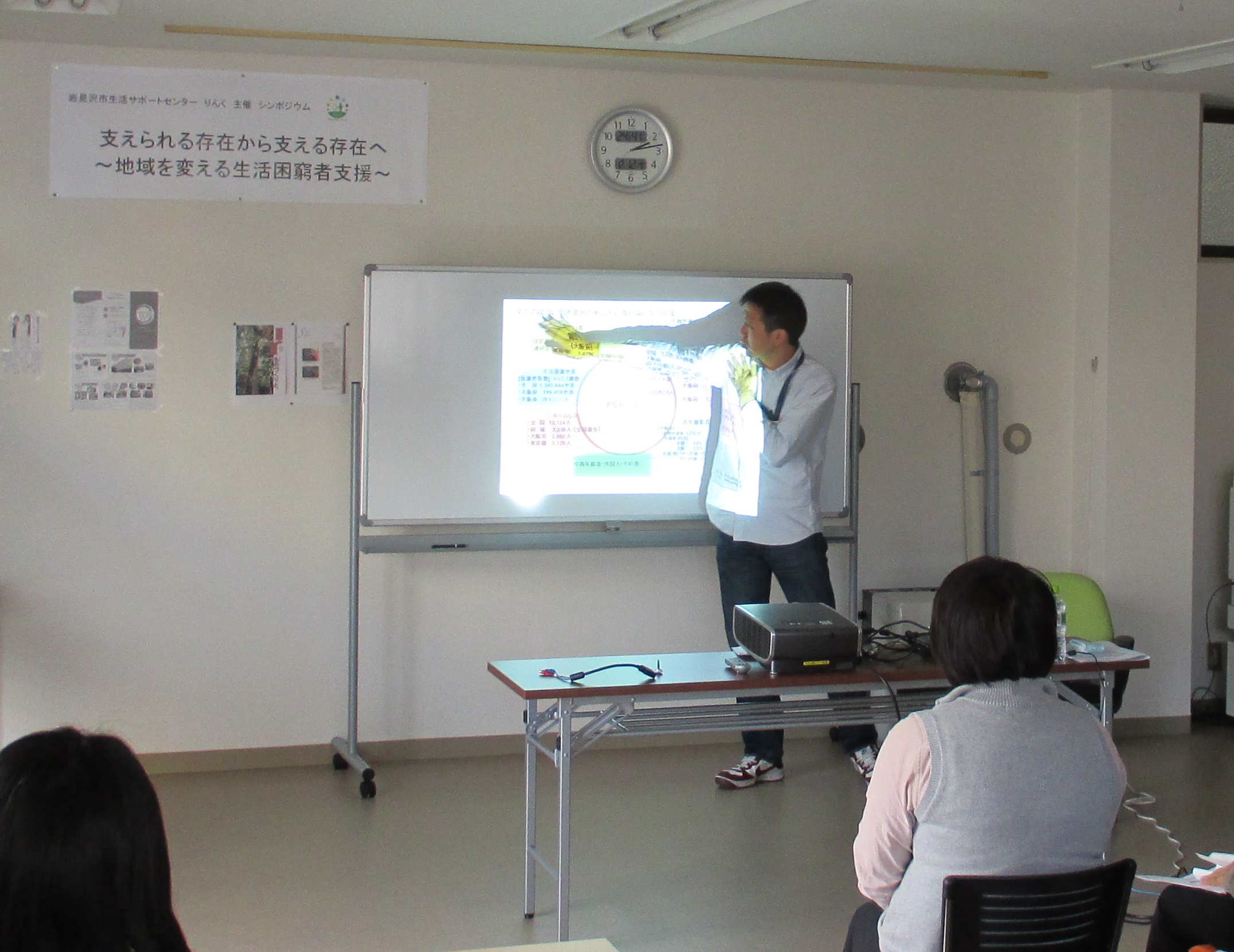 12月12日(木曜日) 大阪府箕面市で今年4月からいち早く生活困窮者自立促進支援事業に取り組んでいるNPO法人暮らしづくりネットーワーク北芝の池谷啓介氏を招いて、箕面市での取り組みについて講演していただきました。りんくの1階でやや手狭ではありましたが、30名以上の方にお集まり頂くことができ、盛況なシンポジュームになりましたこと、関係各位の皆様にこの場をお借りしてお礼申し上げます。
