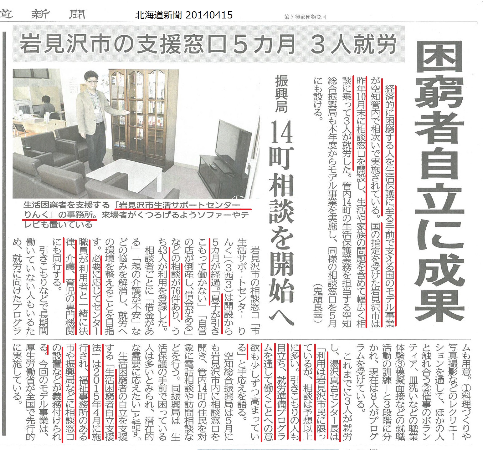 りんくの取組が、2014年4月15日の北海道新聞 空知版に掲載されました。